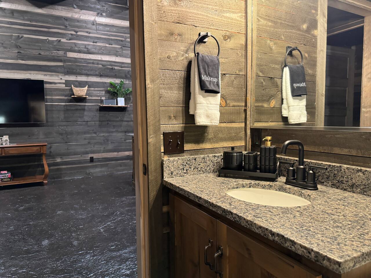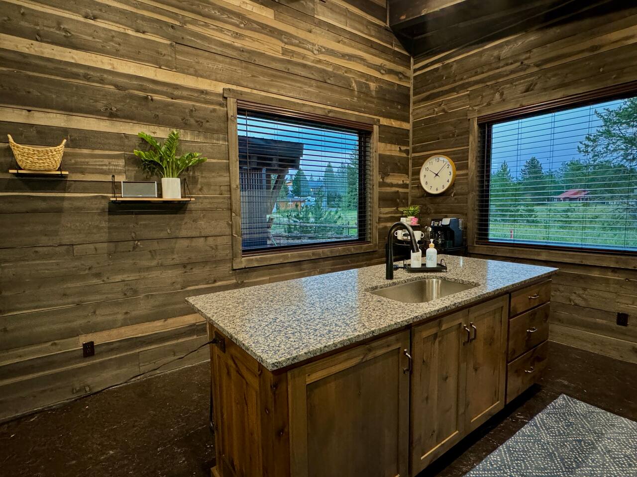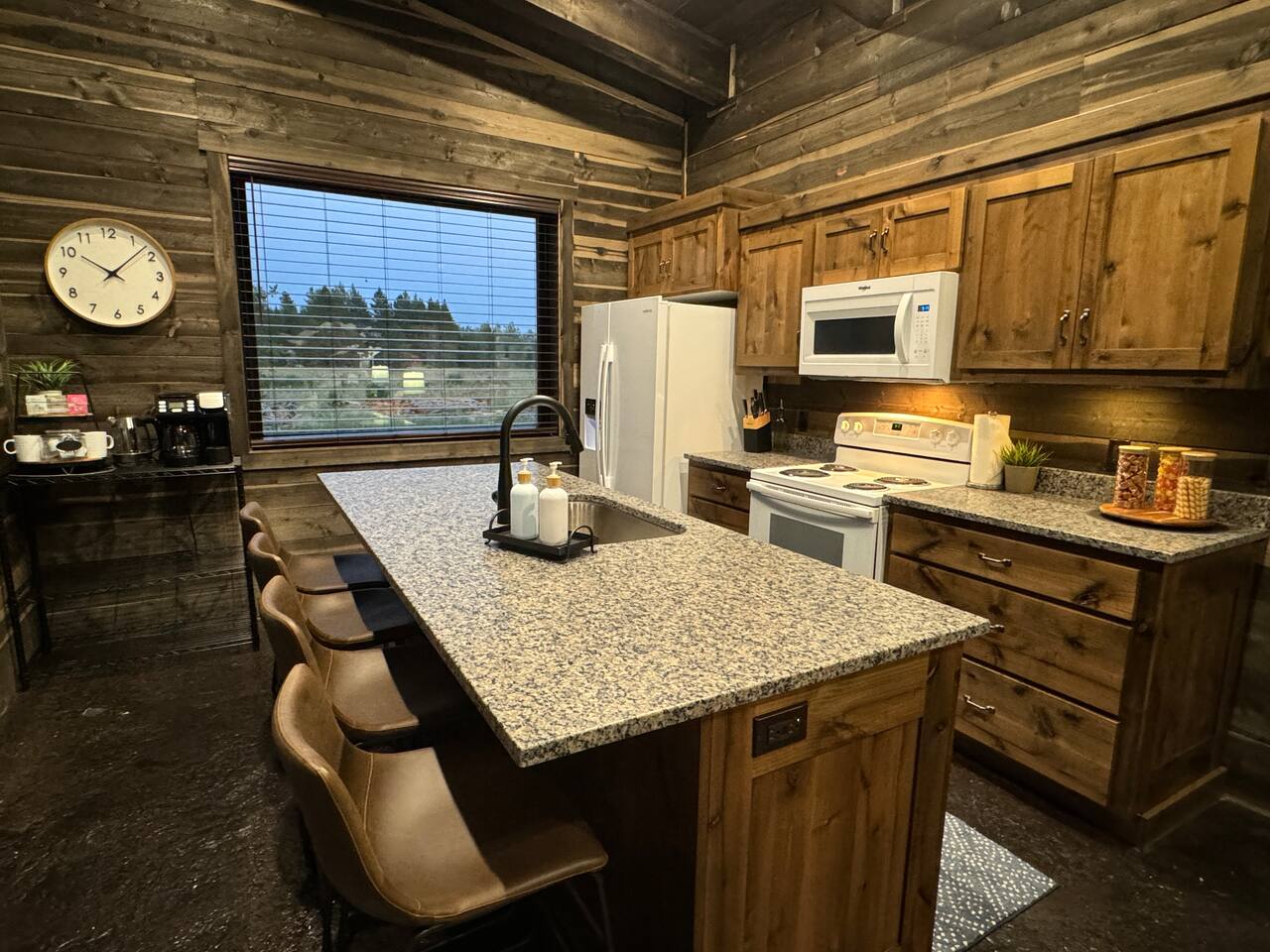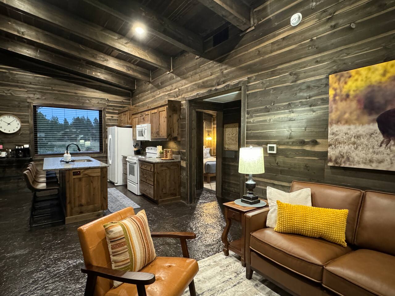 This newly built cabin is conveniency located just off Hwy 20 in the area of Island Park known as Last Chance. It's tucked back in a little quiet community of other newly built cabins that offer travelers comfortable and modern accommodations for up to 4 adults. Pull right up to the cabin and easily unload your gear right into the front door. No dirt driveways or stairs to mess with! The spacious kitchen has everything you'll need to prepare a homemade meal or walk right across the road and enjoy a delicious meal at TroutHunter. It's well known for having the best breakfast around! The cabin has a coffee/tea bar where we provide a single cup/drip combo coffee machine along with coffee grounds and k-cups. The living room is a great place to relax and unwind as you stream your favorite show on the 65" smart TV. Play games, read a book, plot your next days' adventures or sit around and tell fishing stories with your pals. Then retreat to your private bedrooms for a restful nights' sleep. Each bedroom has its own custom closet and drawers, lamps, bedside tables, device charging outlet and most importantly, clean and comfortable sheets and bedding on top of comfortable mattresses. There are extra mirrors in each of the bedrooms as well as a desk for working remotely. The bathroom sits between the two bedrooms for easy access, and we provide plenty of high-quality towels, hand towels and wash cloths. Outside there is a propane grill (propane provided) and some additional seating for soaking in those gorgeous Idaho evenings. You also have access to the 2 community hot tubs that are shared between the cabins.