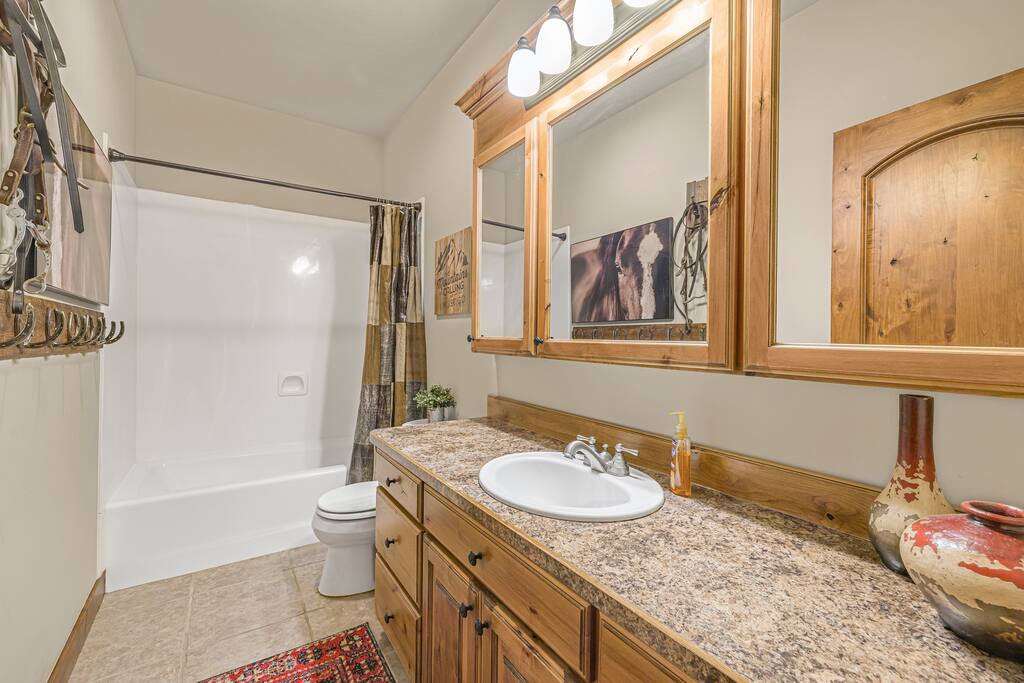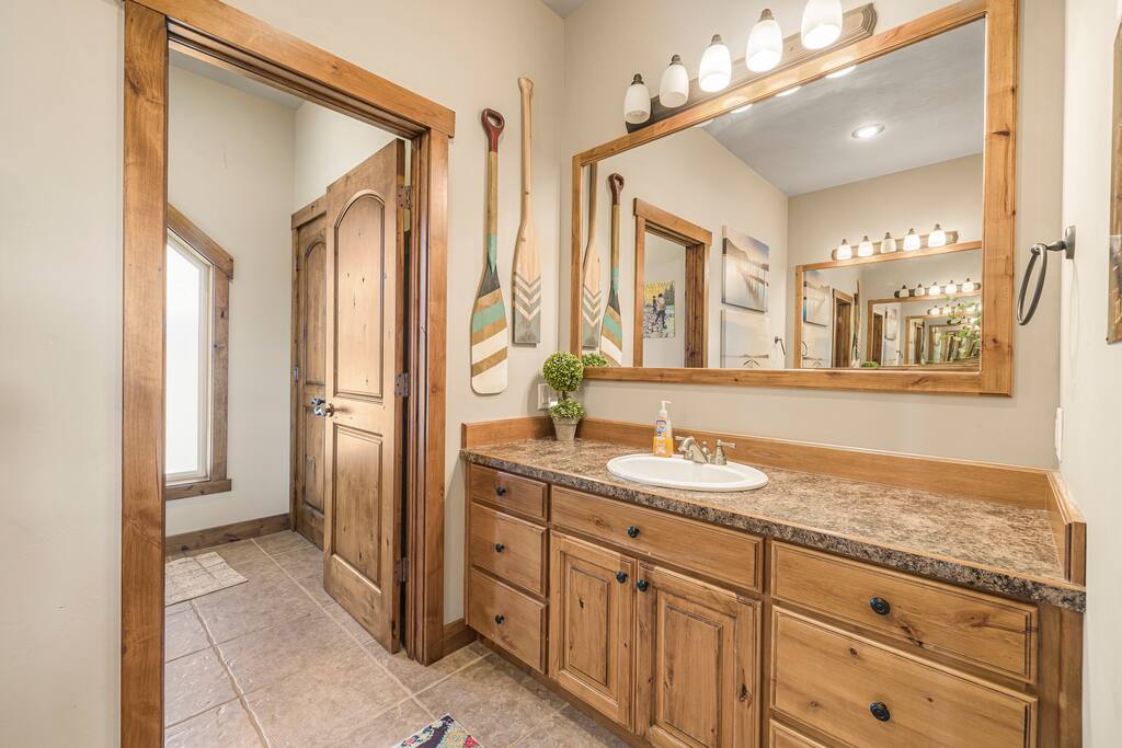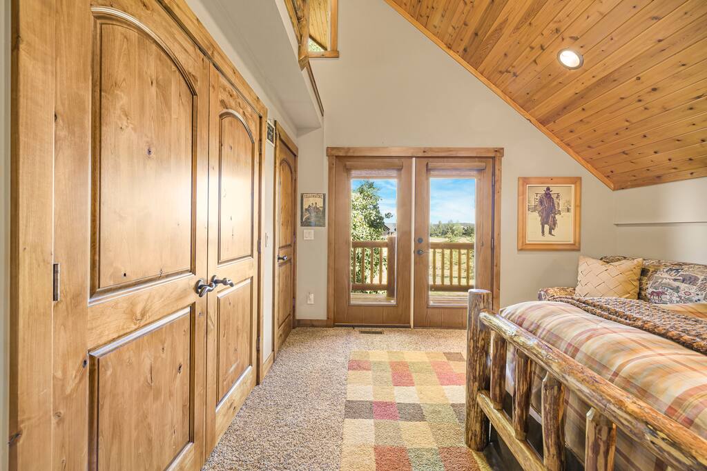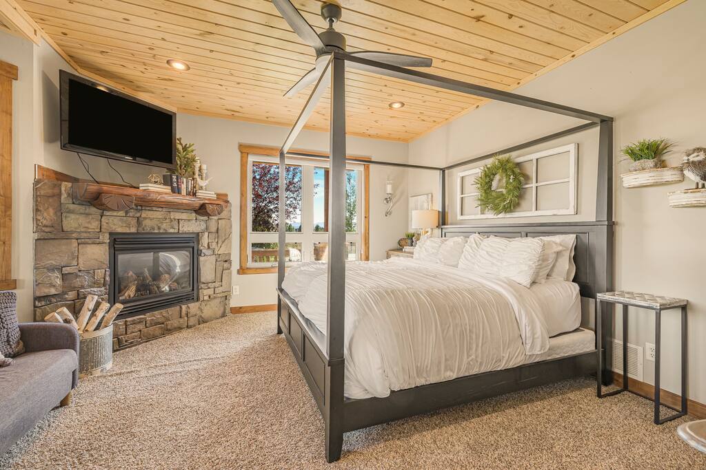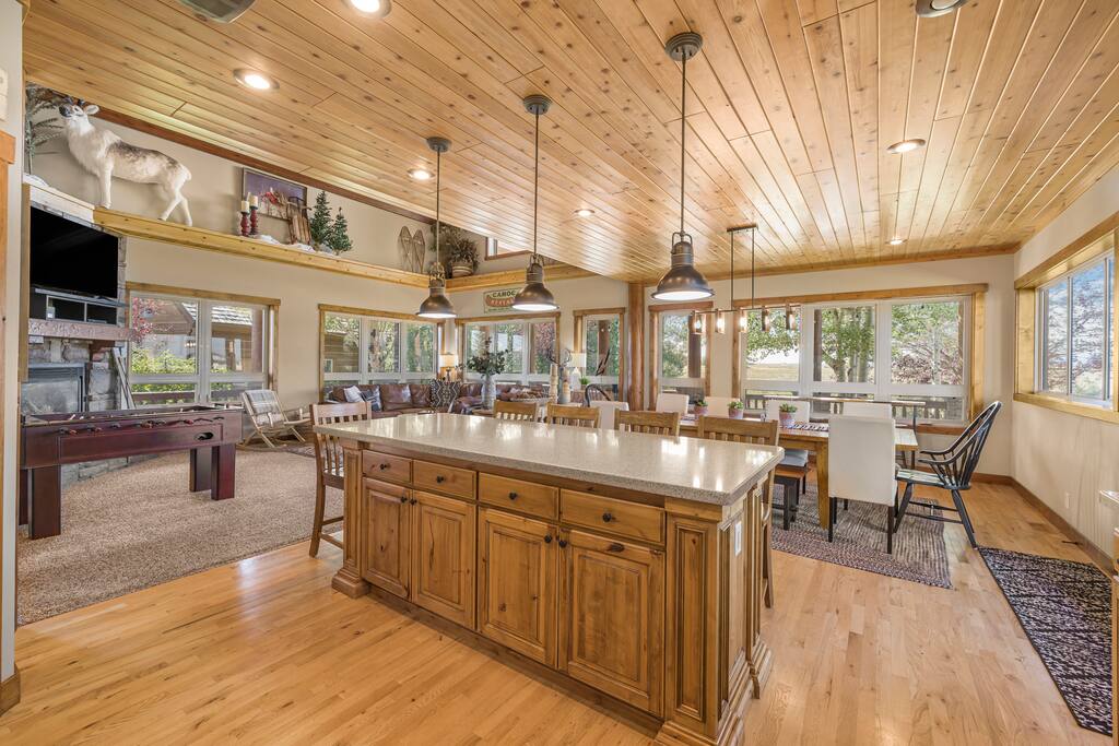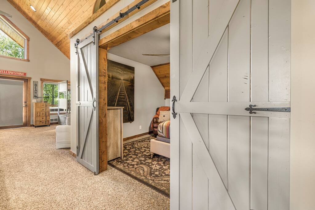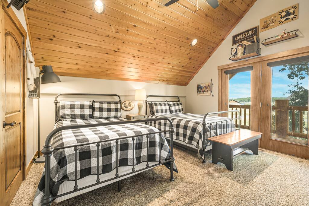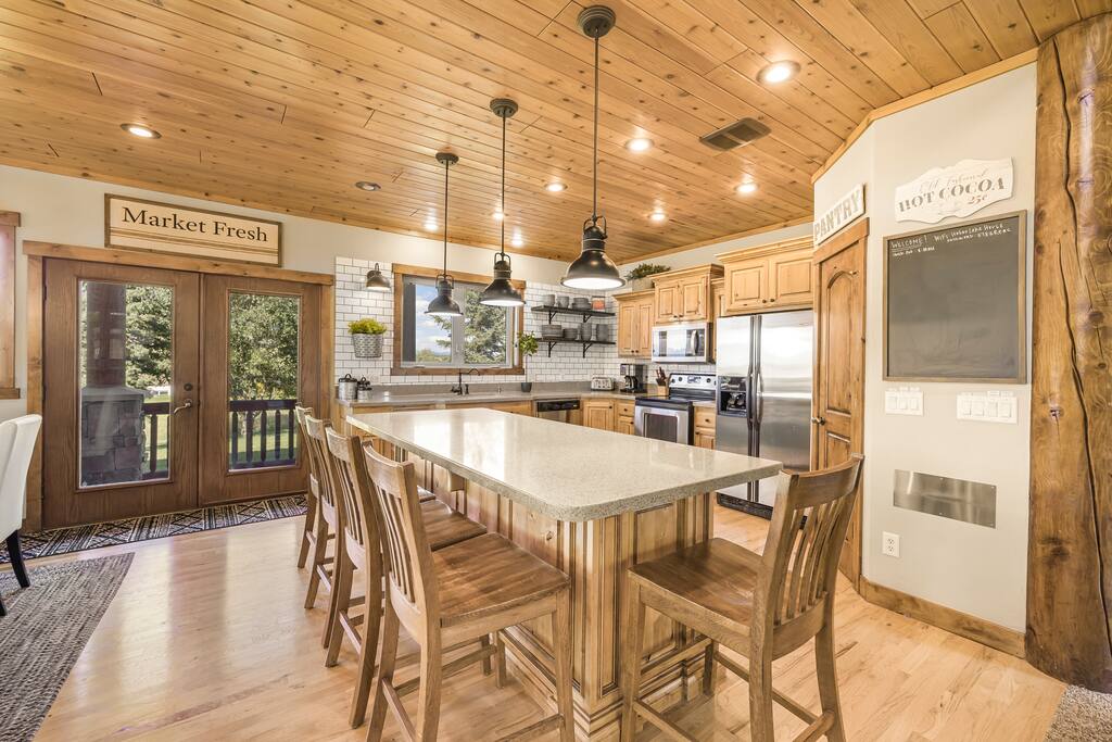 Cabin Layout: Main Level - -Primary Bedroom with King Bed and attached full bathroom -Laundry area with 2 sets of washers and dryers -Full bathroom -Children's cubby/playroom tucked under the stairs -Spacious living room -Large entryway with plenty of space for storing your gear -Dining area -Full kitchen Upstairs - -Private Bedroom with queen bed (balcony access) -Private Bedroom with 2 queen beds (balcony access) -Private Bedroom with queen bed -Open loft area with 9 single beds (3 sets of triple bunks) *Please note the 165 lb. weight limit on these beds Outdoors - -Wrap around deck that circles the entire property -On the backyard lower deck, we have a long outdoor table that sits under string lights -Hot tub on the upper deck along with ample seating on the outdoor couch