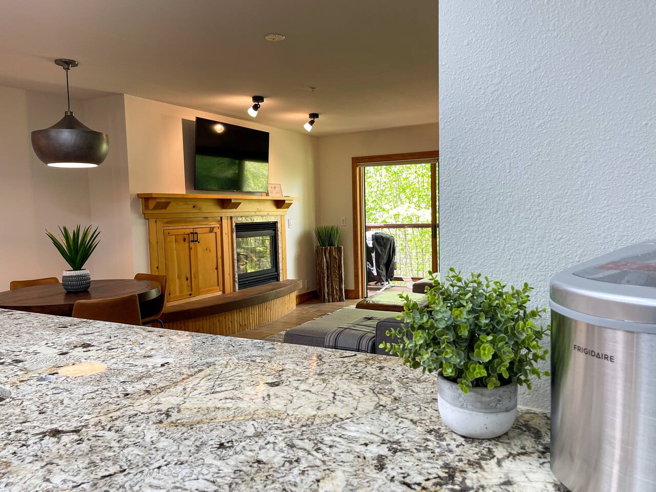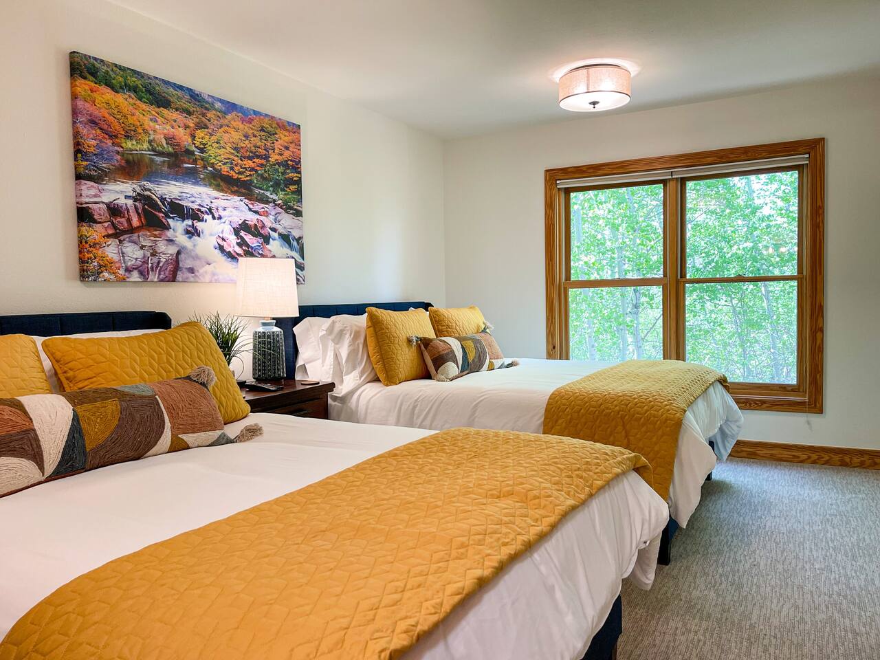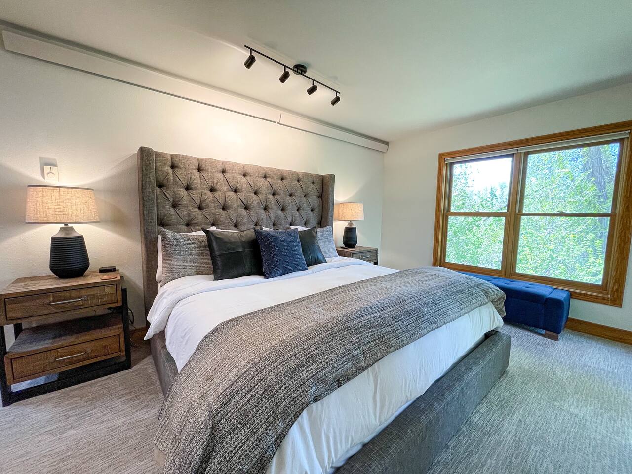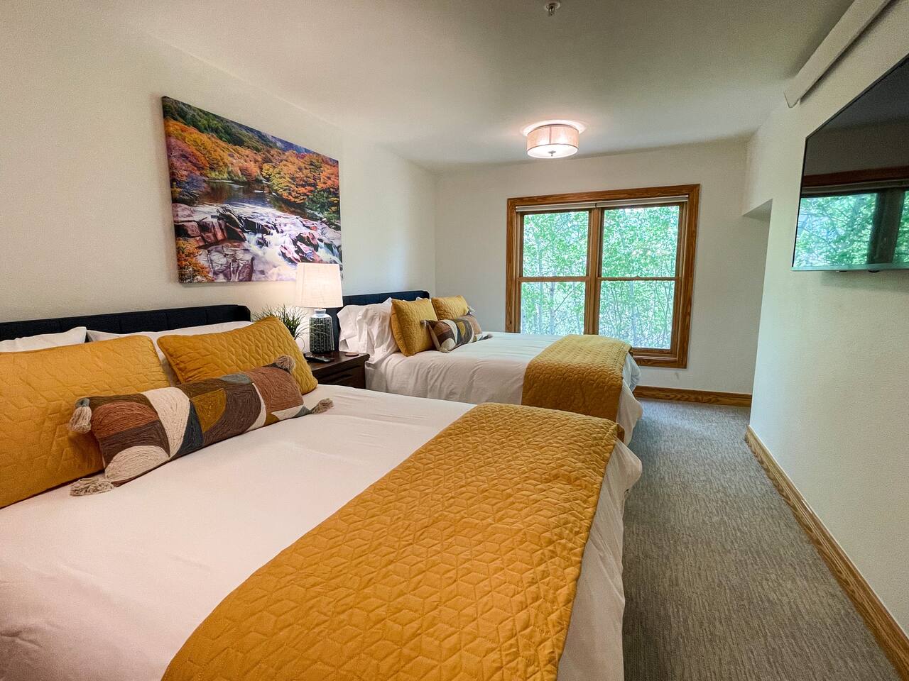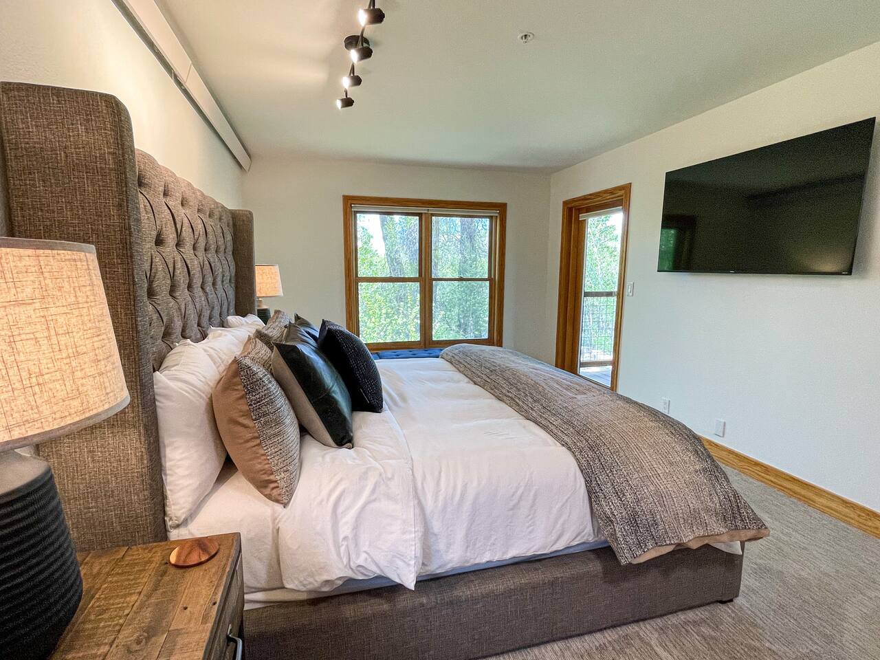 Aside from being in such a prime location for your "home base", the resort offers a community hot tub and fitness center for our guests to enjoy along with free parking, speedy Wi-Fi, and all the comforts of home. Teton Valley Bus Service also stops directly in front of the property for easy winter transport to Targhee! Our privately owned condo has a gorgeous fully equipped kitchen with barstool seating, a central dining area and a roomy and comfortable living room with large screen TV and fireplace. Each of the bedrooms also have large TVs. Aside from the comfy beds and immaculate cleanliness of the space, my favorite part of the condo is the outdoor space where you can enjoy your morning coffee with a beautiful view from one of the two patios overlooking the creek. Bedroom 1 - King Bed Bedroom 2 - 2 Queen Beds