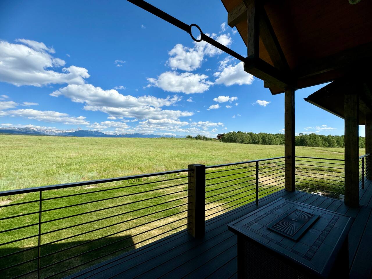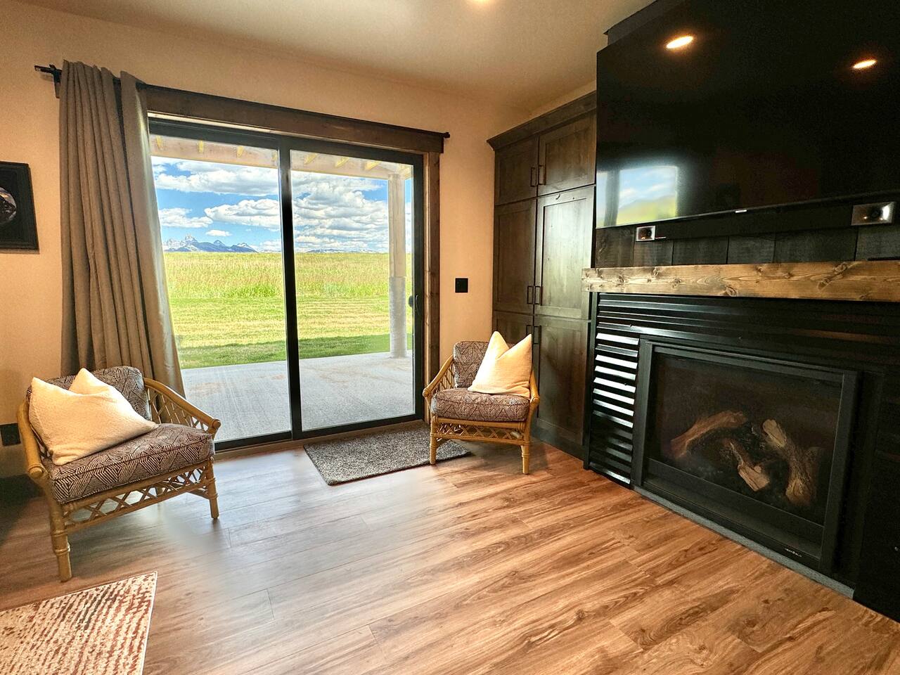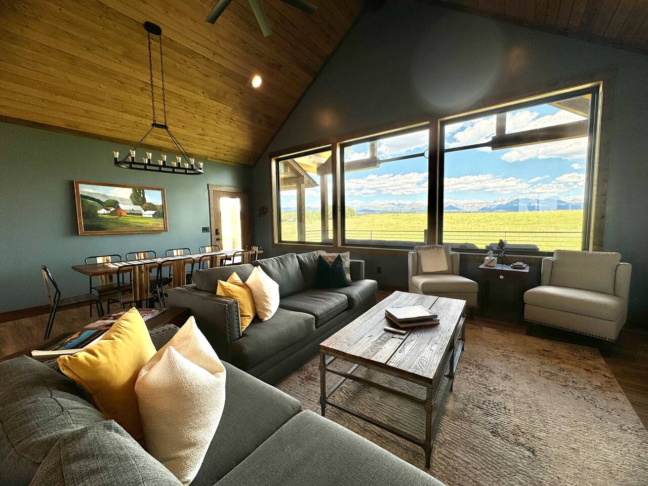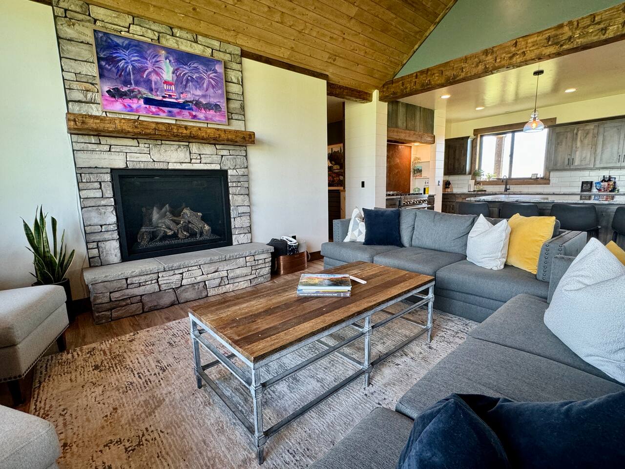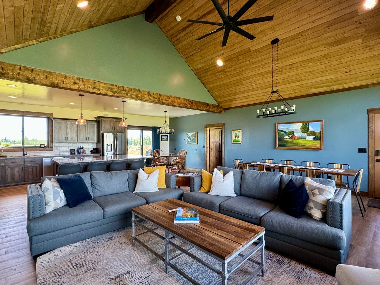 A little bit about the space: Newly built in 2023 and located on 3.2 acres on what is known as “the quiet side of the Tetons”. There are other homes in sight, but the properties are spread out, so you’ll be able to enjoy privacy and relaxation. On the main level, you’ll find a spacious kitchen with granite countertops, stainless steel appliances, six burner propane range, wine fridge and comfortable bar top seating for 6. Fully stocked with pots, pans, dinnerware and everything you need to prepare a gourmet home cooked meal. There are 2 dining tables with enough seating for the whole crew. The large primary bedroom is custom built around the main attraction – the view! There is a king bed distinctively positioned to enjoy a picture perfect view of the sunrise over the Tetons, an attached bathroom with double sinks and a beautifully designed steam shower. Along with 2 more private bedrooms, each with queen beds, the main floor offers a spacious living, a second bathroom and a large laundry room. Downstairs in the fully finished walk-out basement there are 2 private bedrooms; one with a queen bed and one with 2 singles (day bed style). There is also a section of the living room that is curtained off with 2 sets of bunk beds. The large open living room has another large TV, game table, ping pong table and comfy seating to hang out and relax. All with plenty of natural light and of course, a view of the Tetons! A few unique and interesting features of the home: The majority of the artwork is all original hand paintings from the owner’s grandmother. The canvases were found in an attic and were able to be brought back to life and beautifully displayed to set the tone throughout the home. Many pieces of the furniture are also over 150 years old. While there are vintage pieces, there is no lack of luxury and top of the line features to make your stay relaxing and enjoyable with all the comforts of home. Although Teton Valley is best known for adventure and relaxation its nice to have modern connivences nearby. Grocery stores, restaurants, coffee shops, ski shops, bike shops, fly fishing outfitters, gas stations, liquor stores and pubs are plentiful. This is a great place to stay while you visit the National Parks with convenient access to multiple entrances. -Grand Teton National Park: 1 hour drive -Yellowstone National Park West Entrance: 1.75 hour drive -Yellowstone National Park South Entrance: 2.5 hour drive -Jackson Hole, WY - 1.5 hour drive