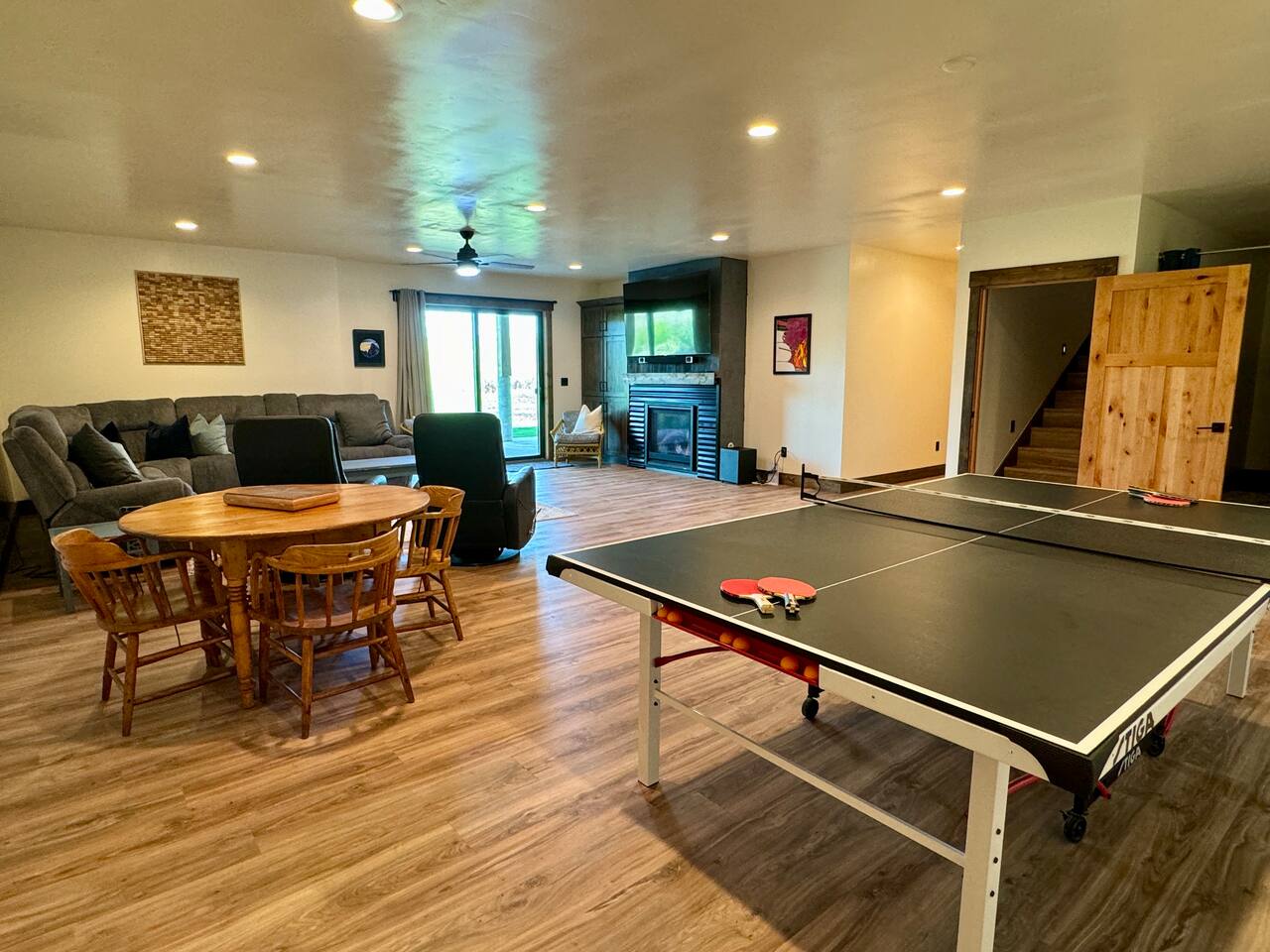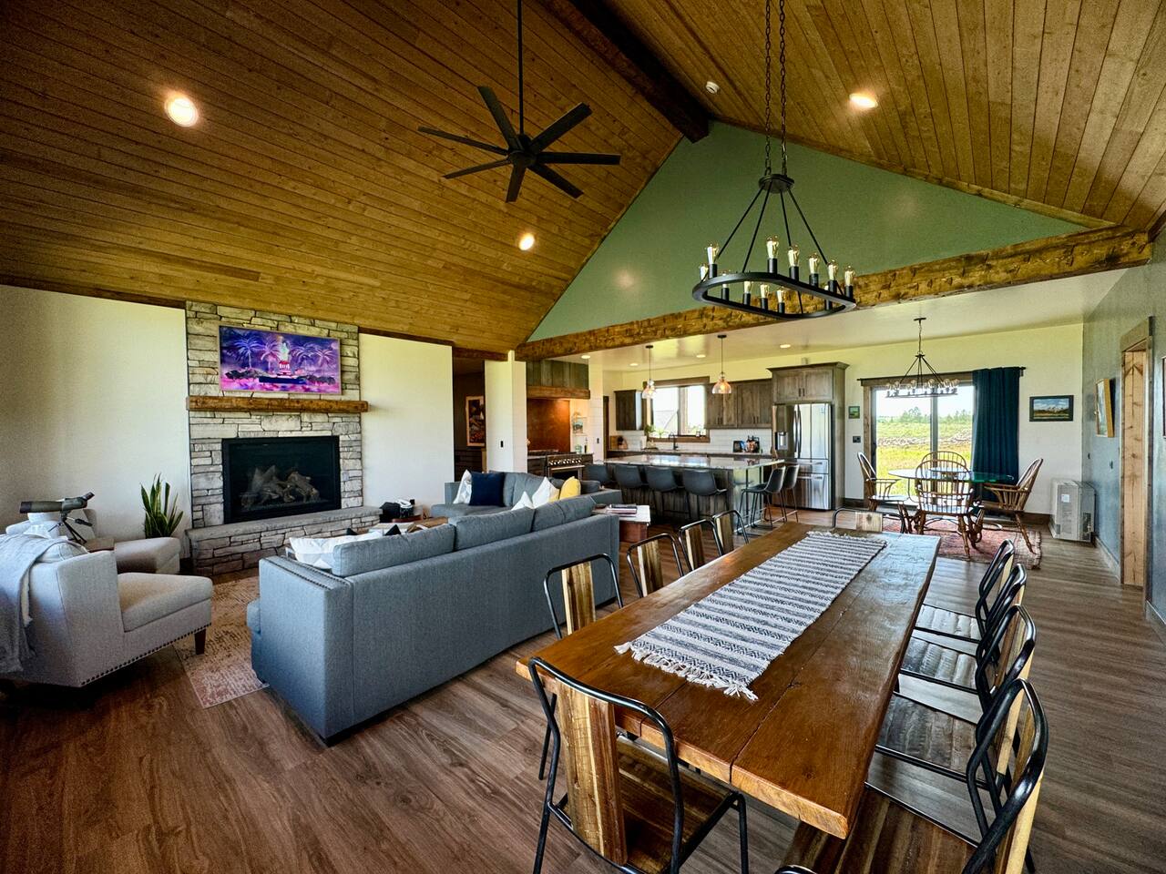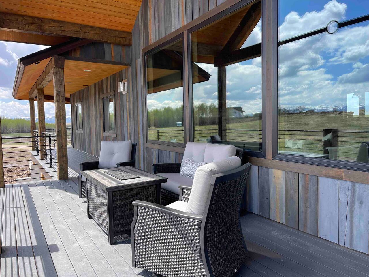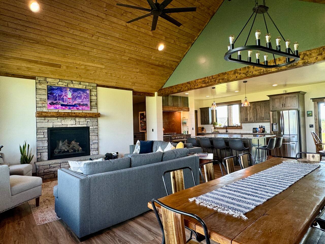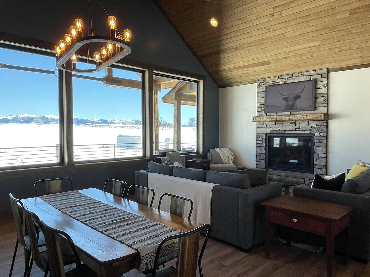 A little bit about the space: Newly built in 2023 and located on 3.2 acres on what is known as “the quiet side of the Tetons”. There are other homes in sight, but the properties are spread out, so you’ll be able to enjoy privacy and relaxation. On the main level, you’ll find a spacious kitchen with granite countertops, stainless steel appliances, six burner propane range, wine fridge and comfortable bar top seating for 6. Fully stocked with pots, pans, dinnerware and everything you need to prepare a gourmet home cooked meal. There are 2 dining tables with enough seating for the whole crew. The large primary bedroom is custom built around the main attraction – the view! There is a king bed distinctively positioned to enjoy a picture perfect view of the sunrise over the Tetons, an attached bathroom with double sinks and a beautifully designed steam shower. Along with 2 more private bedrooms, each with queen beds, the main floor offers a spacious living, a second bathroom and a large laundry room. Downstairs in the fully finished walk-out basement there are 2 private bedrooms; one with a queen bed and one with 2 singles (day bed style). There is also a section of the living room that is curtained off with 2 sets of bunk beds. The large open living room has another large TV, game table, ping pong table and comfy seating to hang out and relax. All with plenty of natural light and of course, a view of the Tetons! A few unique and interesting features of the home: The majority of the artwork is all original hand paintings from the owner’s grandmother. The canvases were found in an attic and were able to be brought back to life and beautifully displayed to set the tone throughout the home. Many pieces of the furniture are also over 150 years old. While there are vintage pieces, there is no lack of luxury and top of the line features to make your stay relaxing and enjoyable with all the comforts of home. Although Teton Valley is best known for adventure and relaxation its nice to have modern connivences nearby. Grocery stores, restaurants, coffee shops, ski shops, bike shops, fly fishing outfitters, gas stations, liquor stores and pubs are plentiful. This is a great place to stay while you visit the National Parks with convenient access to multiple entrances. -Grand Teton National Park: 1 hour drive -Yellowstone National Park West Entrance: 1.75 hour drive -Yellowstone National Park South Entrance: 2.5 hour drive -Jackson Hole, WY - 1.5 hour drive